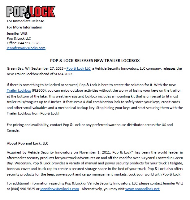 Pop & Lock Releases New Trailer Lockbox Green Bay, WI, September 27, 2023 - Pop & Lock LLC, a Vehicle Security Innovators, LLC company, releases the new Trailer Lockbox ahead of SEMA 2023. If there is something to be locked or secured, Pop & Lock is here to create the solution for it. With the new Trailer Lockbox (PL9300), you can enjoy outdoor activities without the worry of losing your keys on the trail or at the bottom of the lake. This weather-resistant lockbox includes a mounting kit that is universal to fit most trailer rails/tongues up to 6 inches. It features a 4-dial combination lock to safely store your keys, credit cards and other small valuables and a mechanical backup key. Stop hiding your keys and start securing them with the Trailer Lockbox from Pop & Lock! For pricing and availability, contact Pop & Lock or any preferred warehouse distributor across the US and Canada. About Pop and Lock, LLC Acquired by Vehicle Security Innovators on November 1, 2011, Pop & Lock® has been the world leader in aftermarket security products for your truck adventures on and off the road for over 30 years! Located in Green Bay, Wisconsin, Pop & Lock provides a variety of manual and power security products for your truck’s tailgate, tonneau cover and truck cap to create a secured storage space in the bed of your truck. Pop & Lock also offers security products for the Jeep, powersport and cargo management markets. Lock your world with Pop & Lock! For additional information regarding Pop & Lock or Vehicle Security Innovators, LLC, please contact Jennifer Witt at (844) 996-5625 or jenniferw@vsilocks.com. Alternatively, you may visit www.popandlock.net. Press Release Type: Product Company: Vehicle Security Innovators Booth #: 56027 Show Categories: Trucks, SUV's & Off-Road Media Contact Name: Jennifer Witt Media Contact Email: jenniferw@vsilocks.com Media Contact Phone: 844-996-5625 Photo Gallery: 102821